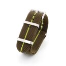 1. Ein Stück Stoff: Ein NATO-Band besteht eigentlich aus einem einzigen, länglichen Streifen Stoff, normalerweise Nylon oder Canvas (Baumwolle) der um das Handgelenk gewickelt wird. Neuere Versionen sind allerdings in vielen anderen Materialien erhältlich, wobei das Ursprungsmaterial durch die Ansprüche der Anwender stark erweitert wurde.